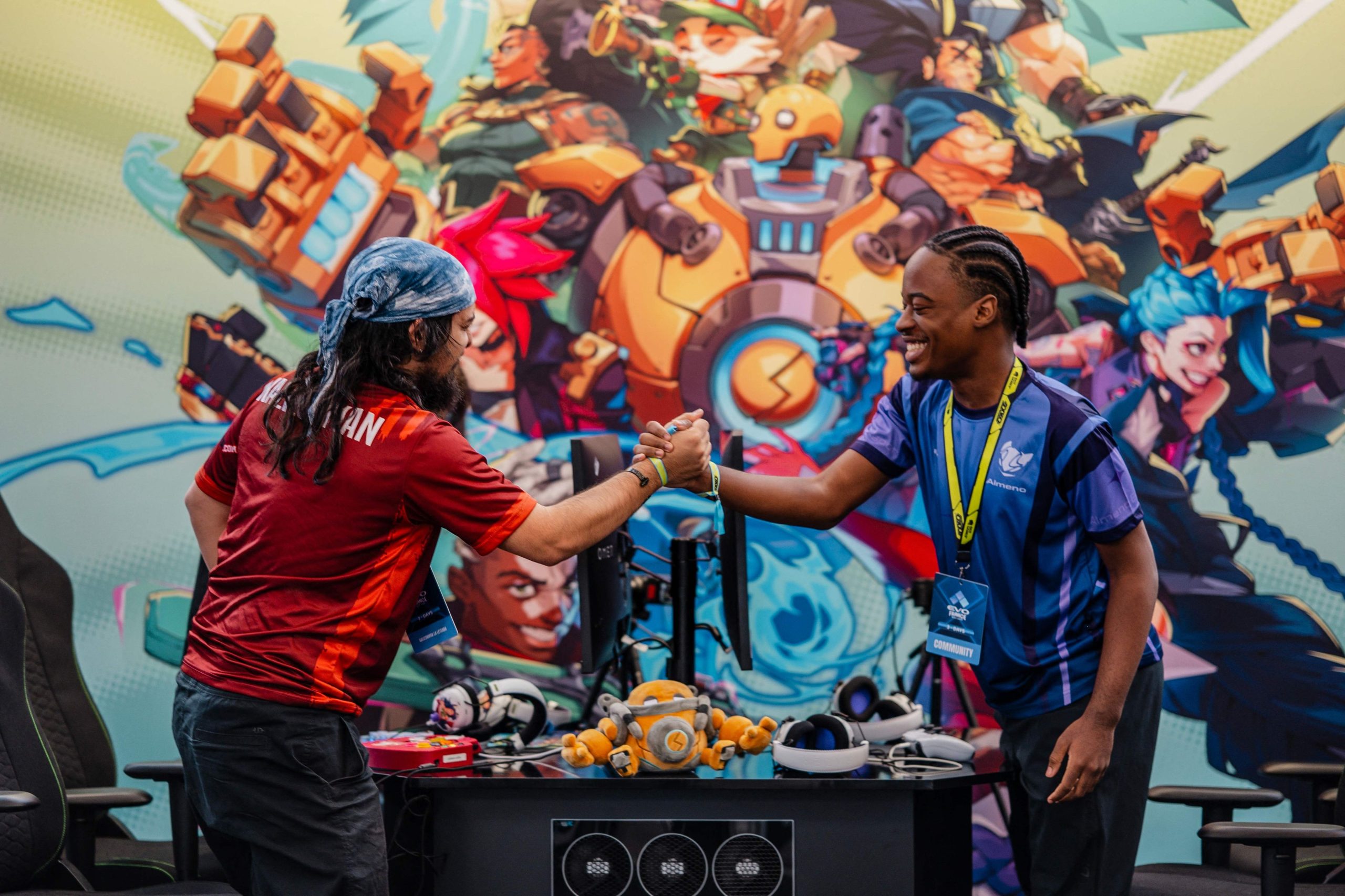Players congratulate each other at the end of a match during the EVO France 2025 fighting game tournament in Nice, southern France on October 11, 2025. (Photo by Frederic DIDES / AFP)