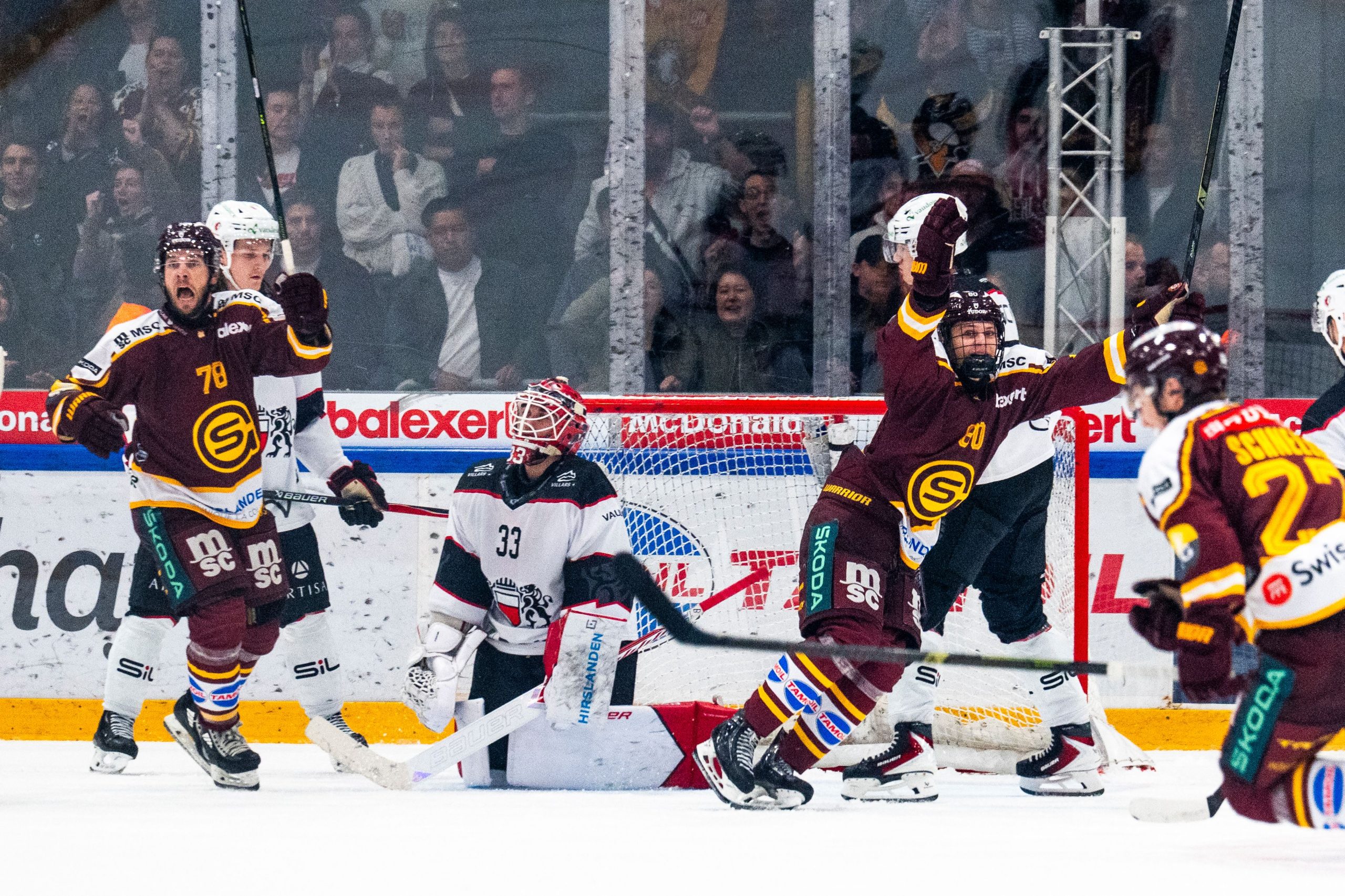 12.10.2025; Genf; Eishockey National League - Genf-Servette HC - Lausanne HC; Marc-Antoine Pouliot (Genf) Torhueter Kevin Pasche (Lausanne) Simas Ignatavicius (Genf) jubeln nach dem Tor zum 4:3 (Laurent Daspres/freshfocus)